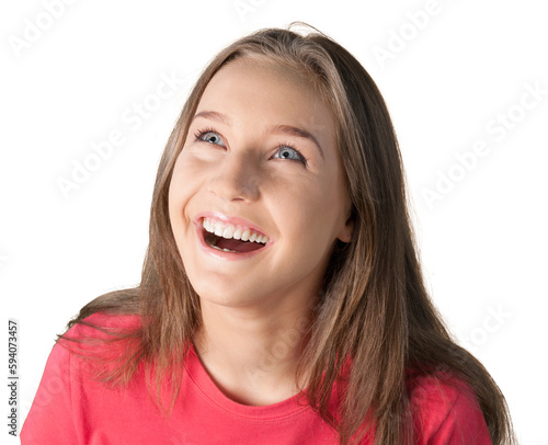 Portrait of young beautiful woman in red shirt isolated on white background