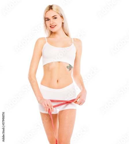 Portrait of young blonde woman on isolated white background