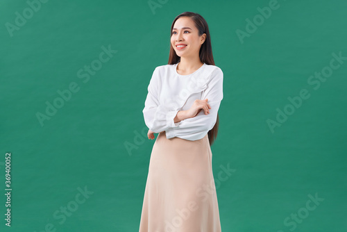 Portrait of young business woman smiling and looking at camera isolated over turquoise background, Happy feeling concept