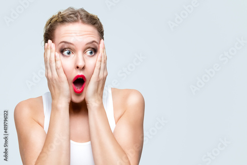 Portrait of Young Caucasian Blond Woman With Lifted Hands Posing With Surprised Facial Expression Against White.