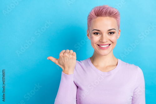 Portrait of young cheerful girl direct finger empty space advertising her hair stylist salon isolated blue color background