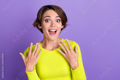 Portrait of young funny positive woman wear green yellow top hands chest shocked reaction thankful isolated on purple color background