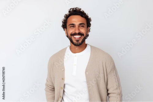 Portrait of young handsome man with curly hair looking at camera and smiling.