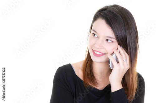 portrait of young happy pretty woman talking on mobile phone outside looking side