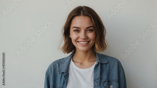 Portrait of young happy white brunette woman smiling standing in front of blank white wall looks in camera