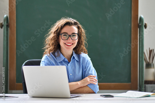 Portrait of young happy woman school professional online teacher or tutor sitting at desk with laptop computer, virtual distance classes for students, teaching remote education webinars concept.