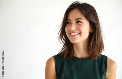 Portrait of young happy woman with dark hair looking left, smiling. Wears dark green dress, posing confidently in studio with white background. Expression cheerful, positive, representing success,