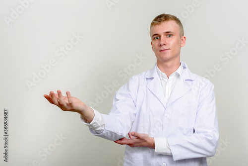Portrait of young man doctor with blond hair