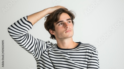 Portrait of young man in striped shirt posing on neutral background. Fashion, lifestyle, and confidence concept for editorial, advertising, and social media