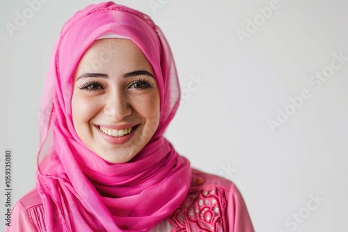Portrait of young Muslim woman in pink hijab.