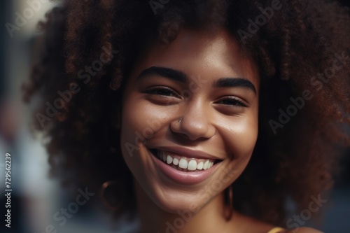 Portrait of young positive African American woman with curly hair laughing brightly while standing on street background