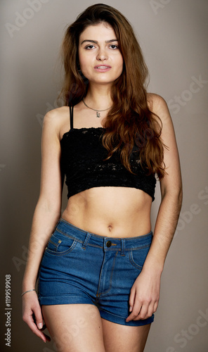 Portrait of young pretty woman in shorts