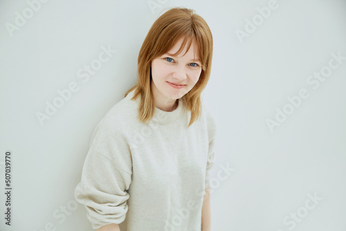 Portrait of young red haired cheerful girl smiling looking at camera over white background.