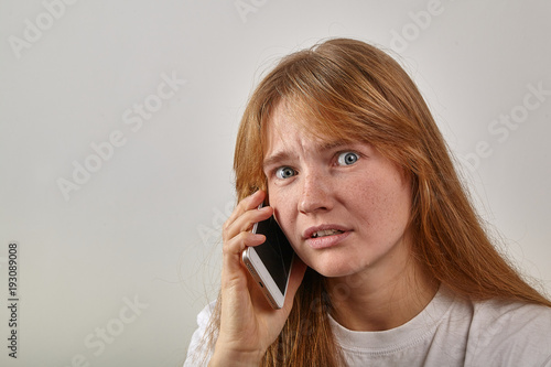 Portrait of young red-headed girl with freckles holding her phone next to her ear and talking with worried expression on her face