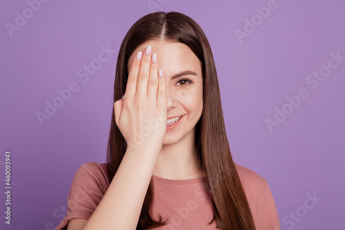 Portrait of young smiling girl cover half face hand isolated on purple background