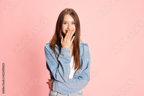 Portrait of young smiling girl covering mouth with hand, feeling surprised against pink studio background. Shocked news. Concept of human emotions, fashion, youth, lifestyle, female beauty, ad
