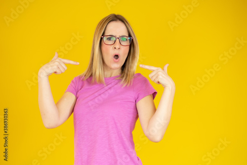 Portrait of young smiling woman in eyeglasses pointing thumbs herself isolated over yellow background