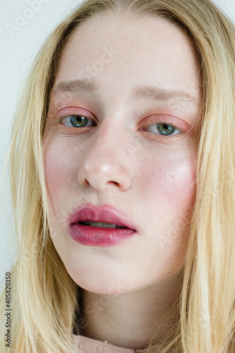 Portrait of young stunning blonde model with bright impressive pink lips. Studio photo shoot of pretty woman. Modern fashion and youth concept