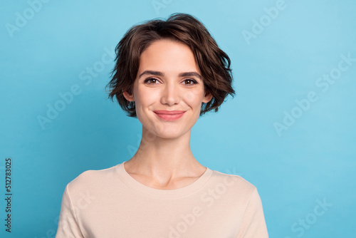 Portrait of young stunning positive lady with short wavy hair wear beige pastel clothes isolated on blue color background