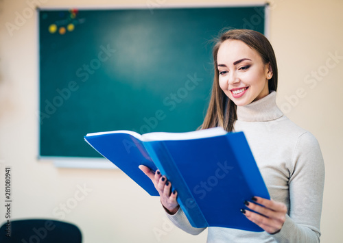 Portrait of young teacher by the blackboard. Teacher in classroom. Back to school.