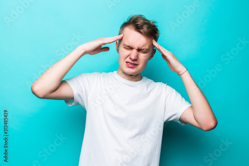 Portrait of young teen man having awful headache while standing over green background.