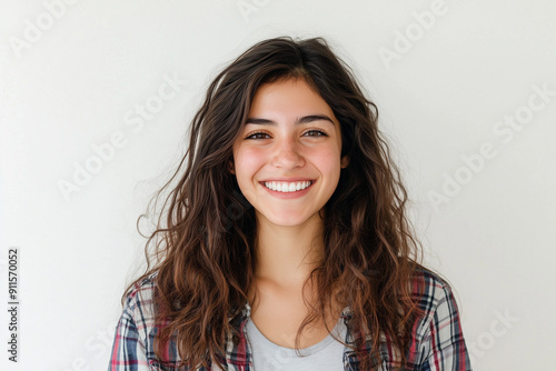 Portrait of young uruguayan woman, happy and smiling isolated on white background