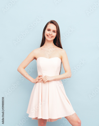Portrait of young winsome woman in romantic attire pretty smiling on blue background. Slim female in pure pink dress posing in studio. Cheerful model. Isolated. Long hair