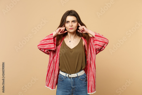 Portrait of young woman in casual clothes looking camera, covering ears with fingers isolated on pastel beige wall background in studio. People sincere emotions, lifestyle concept. Mock up copy space.