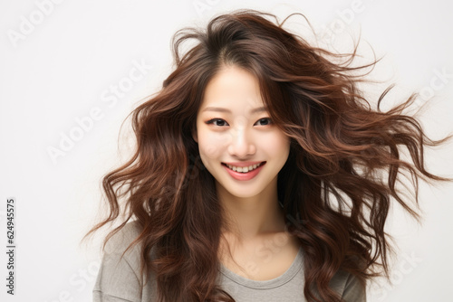 portrait of young woman laughing and gesturing happily in studio setting against white background. She showcases positive emotion of enjoyment, reflecting her carefree and joyful life