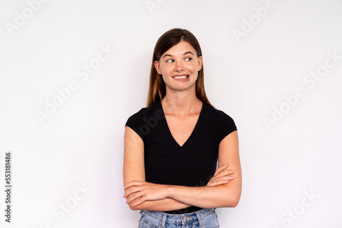 Portrait of young woman looking away and biting lip over white background. Caucasian lady wearing black T-shirt and jeans resisting laugh. Mistrust concept