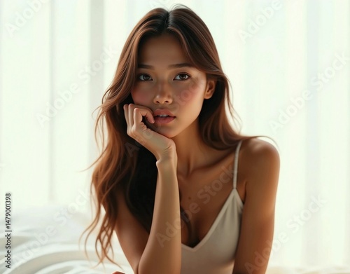 portrait of young woman with long brown hair resting her chin on a white background. Showing confused expression. AI generated