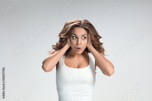 Portrait of young woman with shocked facial expression