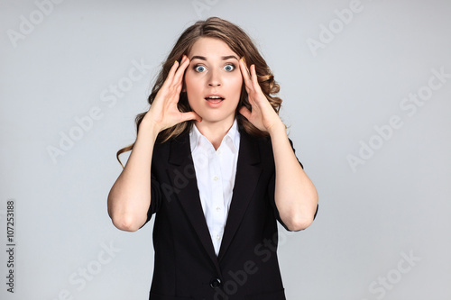 Portrait of young woman with shocked facial expression