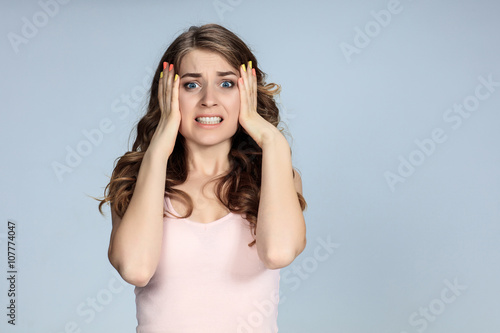 Portrait of young woman with shocked facial expression