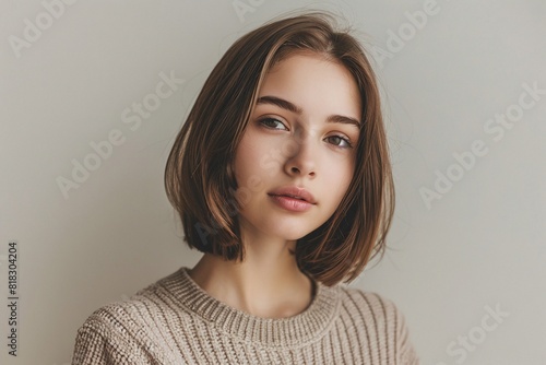 Portrait of Young Woman with Short Brown Hair, Natural Beauty, Minimalist Background, Soft Lighting, Casual Sweater, Thoughtful Expression, Copy Space for Text