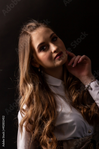 Portrait on a dark background of a young, beautiful woman with ore hair
