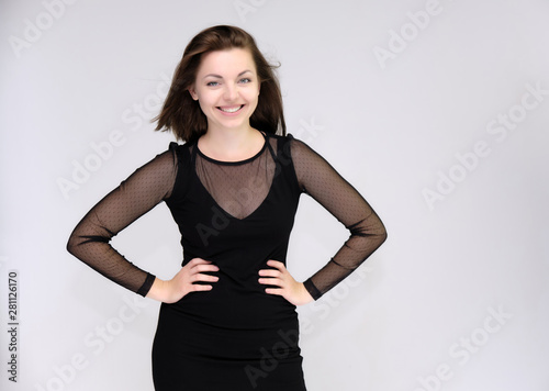 Portrait on white background of a pretty slim beautiful fashionable adult girl with beautiful brunette hair in a black dress. Standing talking demonstrating different poses and emotions