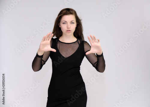 Portrait on white background of a pretty slim beautiful fashionable adult girl with beautiful brunette hair in a black dress. Standing talking demonstrating different poses and emotions
