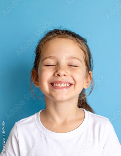 Portrait photo of a little girl smiling with her eyes closed with Plain blue background