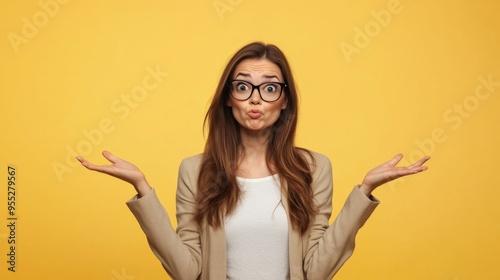 Portrait photo of confused businesswoman in eyeglasses shrugging shoulders questioned about her money isolated on yellow color background