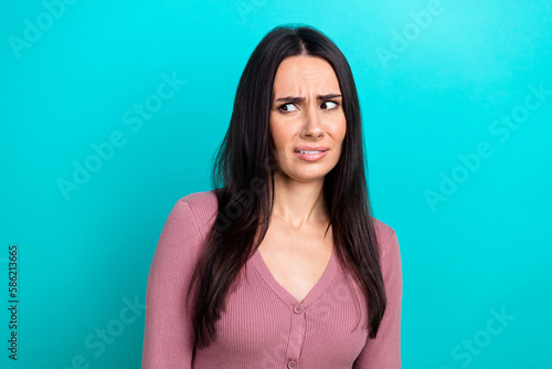 Portrait photo of gloomy young unhappy dissatisfied pretty woman dont like news look empty space smell bad isolated on blue color background
