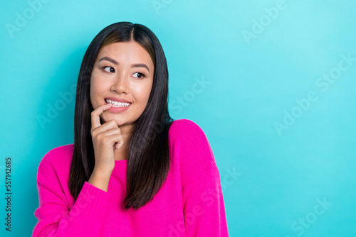 Portrait photo of korean attractive woman bite finger anticipation looking dreamy empty space want new phone isolated on aquamarine color background