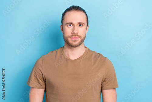 Portrait photo of serious confident businessman entrepreneur worker wear brown t-shirt professional programmer isolated on blue color background