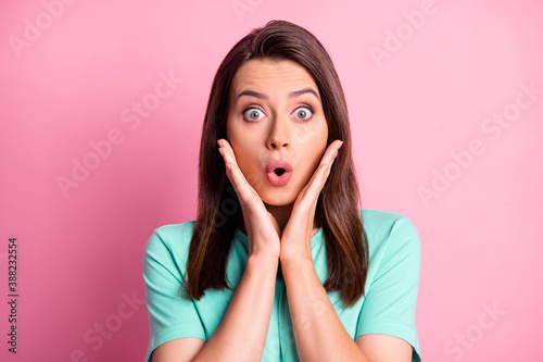 Portrait photo of shocked stressed pretty girl touching cheekbones staring with opened mouth isolated on pastel pink color background