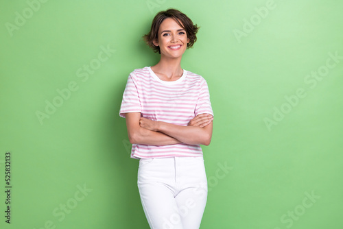 Portrait photo of young attractive pretty nice girl crossed hands smiling beaming good mood wear pink striped t-shirt isolated on green color background