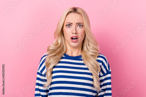 Portrait photo of young confused lady wear striped pullover open mouth shocked how scary film horror isolated on pink color background