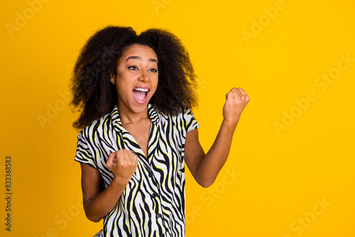 Portrait photo of young funky girlfriend in zebra print shirt with beautiful curly hair winning screaming shouting isolated on yellow color background