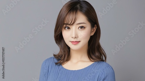 portrait photograph featuring a woman with fair skin and medium-length, wavy dark brown hair background