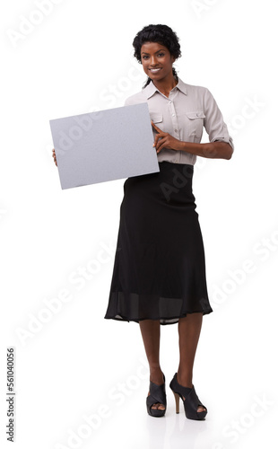 Portrait, poster and mockup with an indian woman in studio on a white background holding a blank sign. Marketing, advertisng and mock up on paper with a female showing space for product placement