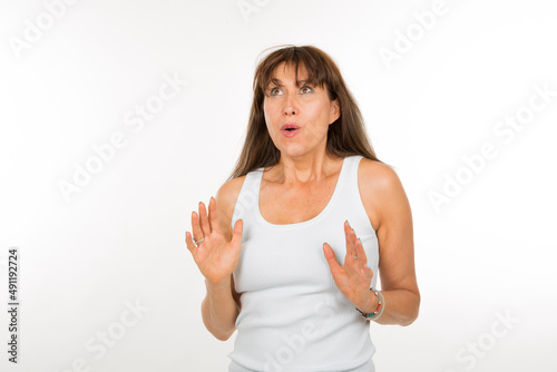 portrait senior woman with surprised expression on white background